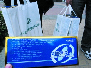 一位來自天津肺癌患者,掛了1800元的號,終于加急見到張悟本,十余分鐘后這位患者就走出診室,五分鐘后得到了一份方子。除綠豆、苦瓜和長條茄子外,特別增加的是服用補鈣沖劑“蓋世骨葆”。記者發(fā)現,這種沖劑出現在很多方子中,不少人都拎著幾十盒的“蓋世骨葆”走出健康之家。沖劑每盒售價120元。那位肺癌患者說,他看到張悟本“肺癌不可怕”的言論,以及其書中提到的治愈肺癌患者的例子,讓他對張悟本寄予希望。