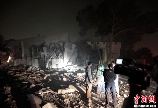 4月25日,在利比亞首都的黎波里,人們站在被轟炸的利比亞領(lǐng)導(dǎo)人卡扎菲的官邸旁。北約戰(zhàn)機(jī)25日凌晨對利比亞領(lǐng)導(dǎo)人卡扎菲在的黎波里的官邸實施轟炸。利比亞政府官員譴責(zé)北約企圖殺害卡扎菲,并稱轟炸造成45人受傷、卡扎菲辦公室受損嚴(yán)重。
