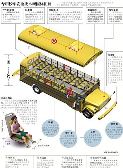 新標準增加了校車最大乘員數量限制、急救箱配備、內裝飾件、信號系統、車內空氣成分等30余項要求,并對學生坐椅、應急出口、踏步等30多項內容進行了修改。