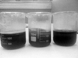 使用豆油作為底油勾兌出的假麻油已經完全凝固,呈不流動的膏狀,色素幾乎沉積在底部,上半部分顯現暗黃色,在三個燒杯中顏色最淺;