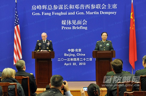 中國人民解放軍總參謀長房峰輝22日下午在北京八一大樓與來訪的美國參謀長聯席會議主席鄧普西舉行了會談。雙方就中美兩軍關系、臺灣、釣魚島、朝核、網絡安全以及其他共同關心的國際和地區問題坦誠交換了意見。會談后,房峰輝與登普西共同舉行了聯合記者會。