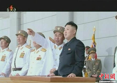 4月25日,為慶祝朝鮮人民軍建軍81周年紀(jì)念日,朝鮮在錦繡山太陽(yáng)宮殿舉行小型閱兵儀式,最高領(lǐng)導(dǎo)人金正恩當(dāng)天率領(lǐng)軍方高層出席建軍節(jié)活動(dòng)。圖為朝鮮電視臺(tái)的閱兵儀式視頻截圖。圖片來(lái)源:中新網(wǎng)
