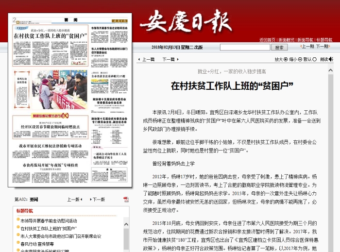 2月8日,冬日暖陽。宜秀區白澤湖鄉龍華村扶貧工作隊辦公室內,工作隊成員楊琳正在整理精神殘疾的“貧困戶”葉中在第六人民醫院買藥的發票,準備一會送到鄉民政部門辦理報銷手續。