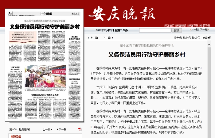 在楊橋鎮鮑沖湖村,有一處省級美麗鄉村示范點——鮑沖湖村錢莊示范點。自2014年至今,幾乎每個夜晚,這位義務保潔員都要出來撿拾白色垃圾。這位義務保潔員便是五組組長,錢莊自然村落美麗鄉村建設理事長,現年53歲的彭小武。