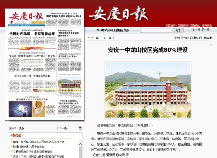 [安慶日報頭版] 安慶一中龍山校區(qū)完成80%建設(shè)