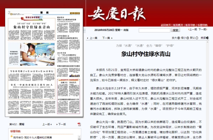 5月21日,宜秀區大橋街道象山村內的象山大溝整治工程正在熱火朝天的施工。象山大溝貫穿著村莊,連接著大龍山水源和石塘湖水源,昔日讓村民詬病的一溝渾水,如今已漸成一渠活水,釋義著村莊對“綠水青山”的守護。