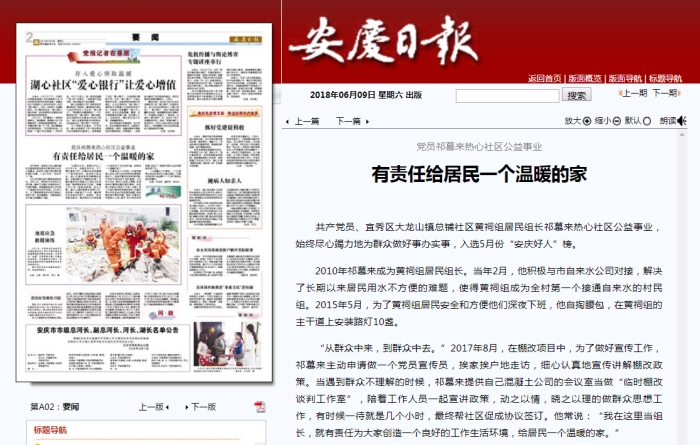 [安慶日報] 黨員祁慕來熱心社區(qū)公益事業(yè) 有責(zé)任給居民一個溫暖的家
