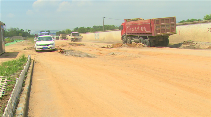 隨后記者來到大龍山鎮政府西側道路上,在西側道路上記者看到,道路坑坑洼洼,車輛無法通過,需要在旁邊繞行。道路上塵土飛揚。道路旁的墻上公益廣告破舊,上面鋪滿塵土。
