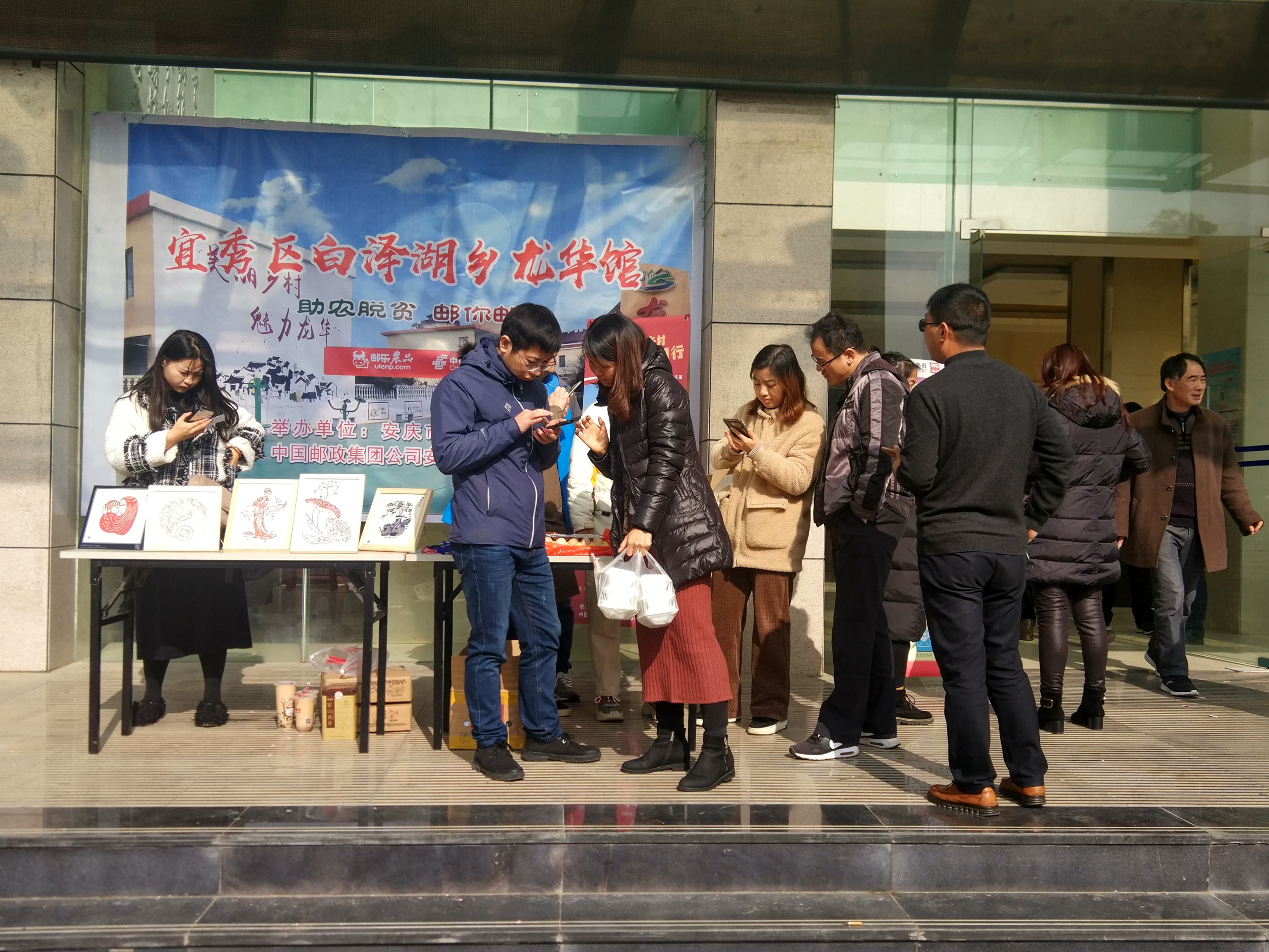 12月26日中午,由宜秀區商務局和安慶郵政聯合舉辦的農村電商扶貧產品展銷活動在學苑大廈門前廣場舉辦。活動現場,人們紛紛掏出手機,爭相掃碼注冊下單,不多時500份龍華村土雞蛋銷售一空。