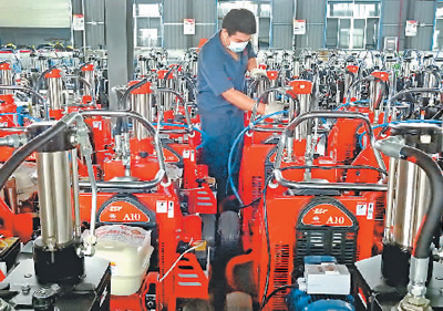 近日,在位于江蘇贛榆經濟開發區內的江蘇三旗流體設備有限公司,工人正檢驗一批即將出廠的高壓無氣噴涂機。
