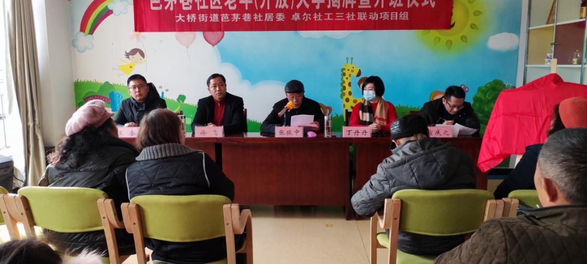 2020年12月27日,冬陽和煦,溫度回升,氣溫怡人。安慶市宜秀區(qū)大橋街道芭茅巷社區(qū)二樓居家養(yǎng)老服務(wù)站,座無虛席,喜氣洋洋,拭目以待芭茅巷老年(開放)大學(xué)揭牌儀式與開班第一課。