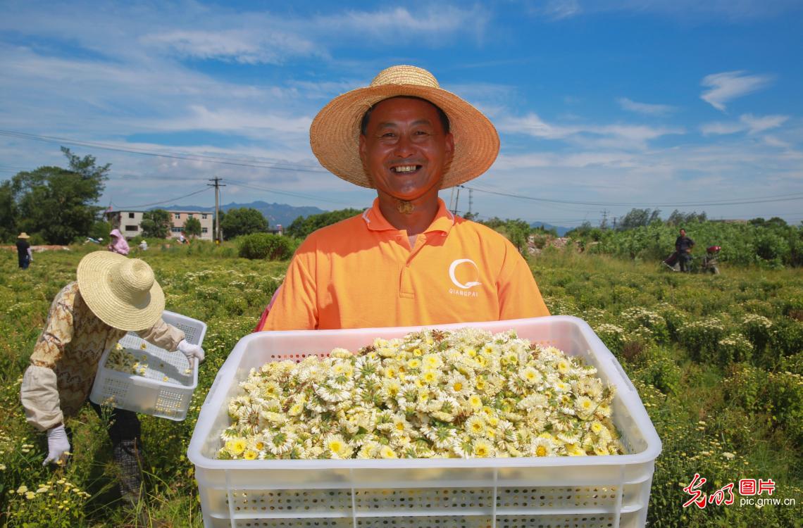 2020年8月14日,農民在安徽省安慶市宜秀區白澤湖鄉白澤社區蘇北菊種植基地里采收蘇北菊。近年來,白澤湖鄉采取以"合作社+種植大戶+貧困戶"的模式,帶動農民脫貧增收。(江勝攝/光明圖片)