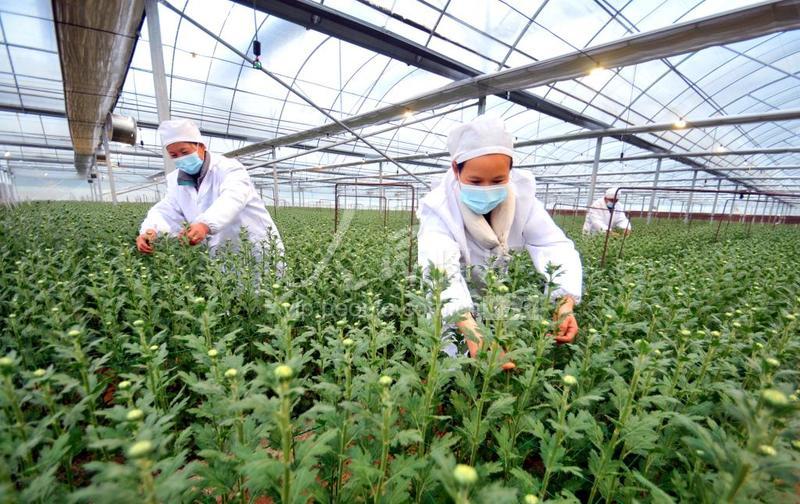 2020年12月1日下午,在安徽省安慶市宜秀區(qū)羅嶺鎮(zhèn)黃梅村鮮切花種植基地,脫貧戶嚴(yán)永香等熟練工正在對祭祀鮮切菊進行舒蕾操作。熟練工人將側(cè)蕾逐株抹除,集中營養(yǎng)供養(yǎng)一枝一花,確保大花品種特性。