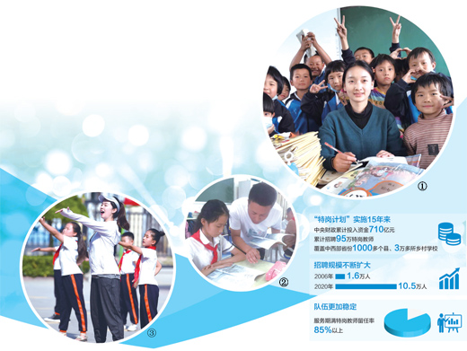 15年來,“特崗計(jì)劃”共為中西部地區(qū)22個(gè)省份1000多個(gè)縣的3萬多所鄉(xiāng)村學(xué)校和教學(xué)點(diǎn)補(bǔ)充95萬名中小學(xué)教師。通過“特崗計(jì)劃”直接或間接補(bǔ)充的教師,是新中國(guó)成立以來數(shù)量最多、學(xué)歷最高、待遇保障最為齊全的新一代鄉(xiāng)村教師。