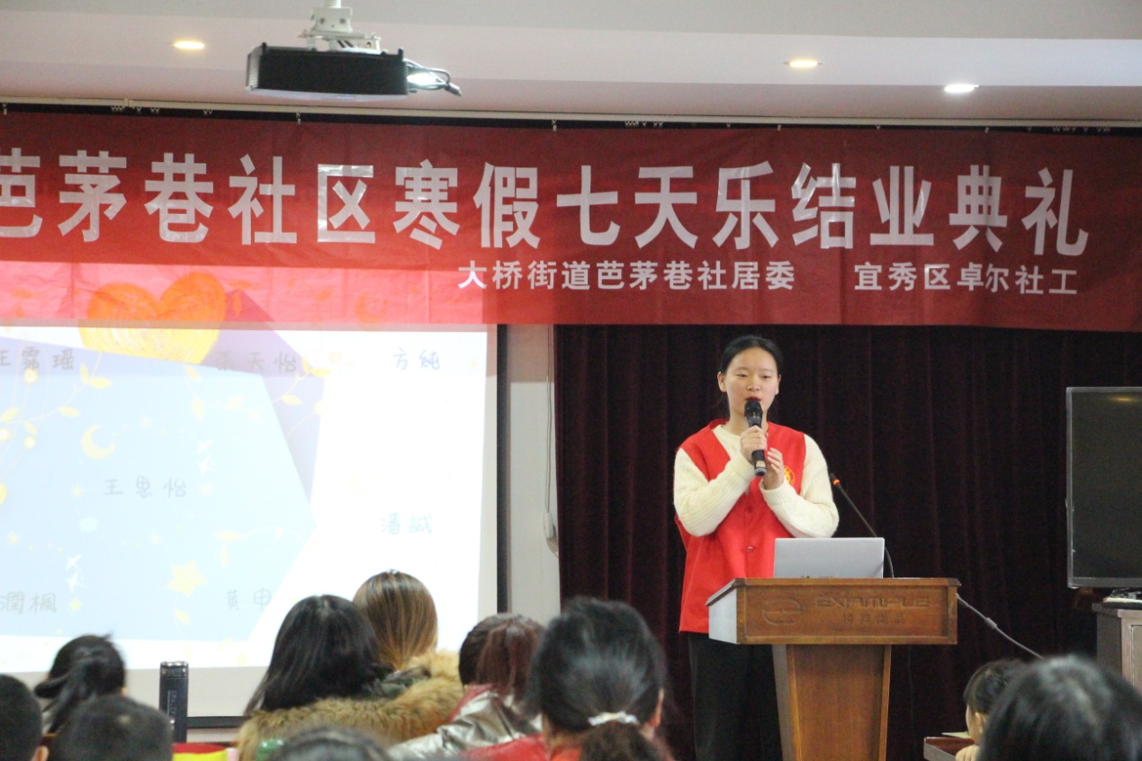 結(jié)業(yè)典禮三個部分組成,分別是成果匯報、作品展示、頒獎典禮等內(nèi)容。匯報環(huán)節(jié)中,志愿者王思怡通過圖片、文字以及生動的講解向在場的所有人匯報了寒假七天樂活動開展及孩子們的優(yōu)秀表現(xiàn)。接著是學(xué)生代表、志愿者代表、家長代表發(fā)言環(huán)節(jié),家長們普遍認為這七天過的值得,很有意義,小朋友們寓學(xué)于樂,收獲頗多,更有表示明年繼續(xù)參加。活動現(xiàn)場還對寒假七天樂“優(yōu)秀學(xué)員”與“優(yōu)秀志愿者”進行了表彰。