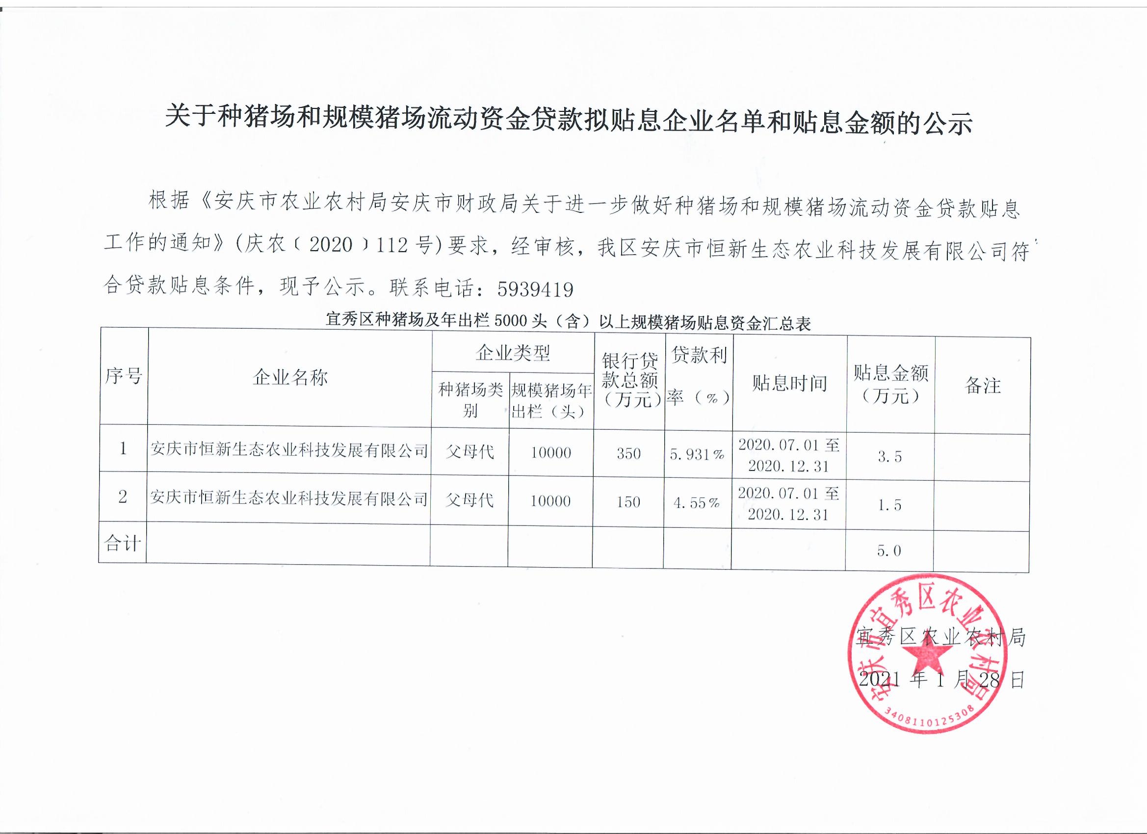 根據《安慶市農業農村局安慶市財政局關于進一步做好種豬場和規模豬場流動資金貸款貼息工作的通知》(慶農﹝2020﹞112號)要求,經審核,我區安慶市恒新生態農業科技發展有限公司符合貸款貼息條件,現予公示。聯系電話:5939419