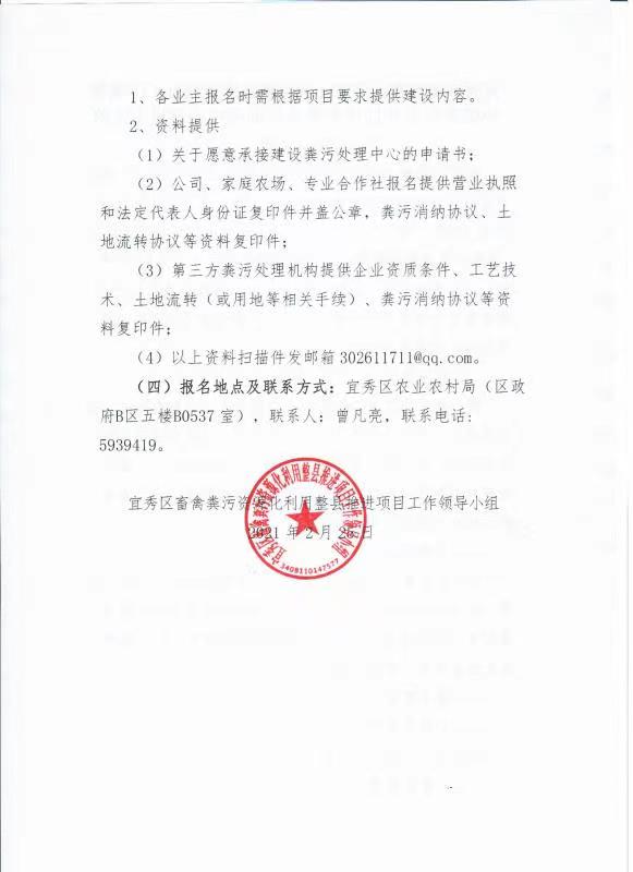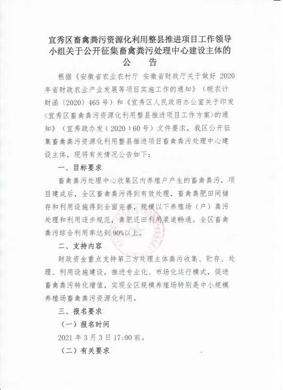 宜秀區畜禽糞污資源化利用整縣推進項目工作領導小組關于公開征集畜禽糞污處理中心建設主體的公告