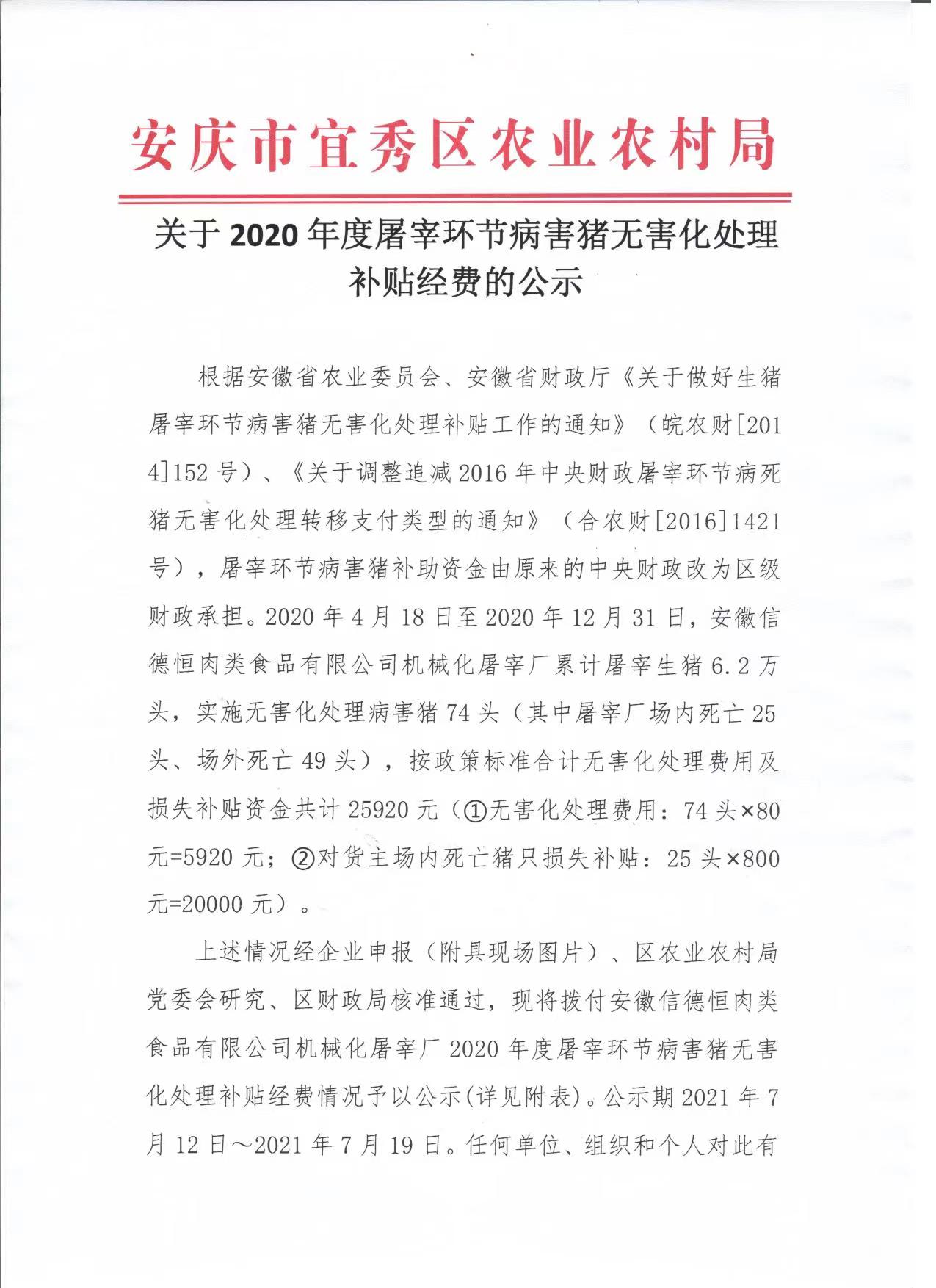 關于2020年度屠宰環(huán)節(jié)病災害豬無害化處理補貼經(jīng)費的公示