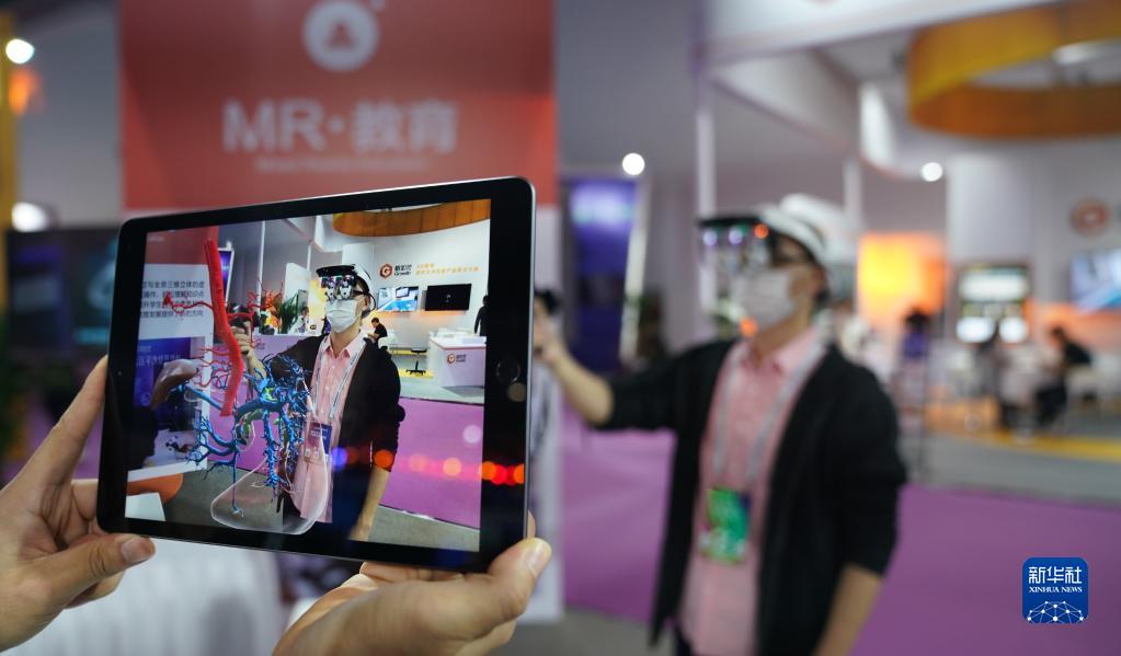 2020年10月19日,2020世界VR產業大會云峰會在江西省南昌市開幕,這是觀眾在大會VR/AR產品和應用展覽會上體驗“MR交互系統”在醫務教學上的應用。新華社記者 胡晨歡 攝