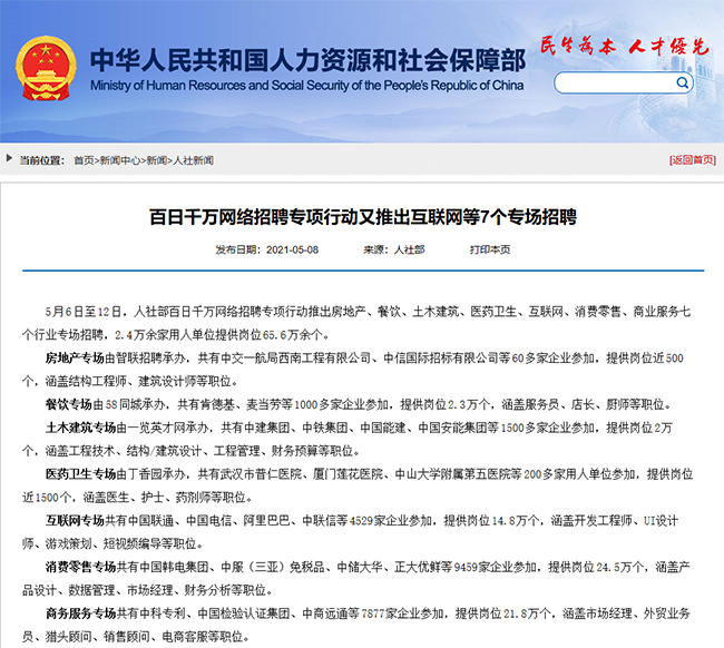 人社部百日千萬網絡招聘專項行動 人社部官網截圖