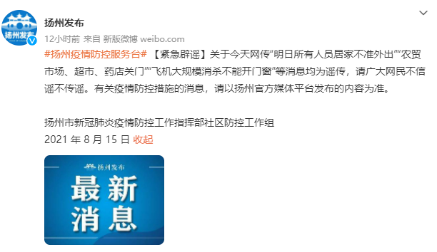 8月15日,網絡上流傳“揚州明日所有人員居家不準外出”“農貿市場、超市、藥店關門”“飛機大規模消殺不能開門窗”等消息。
