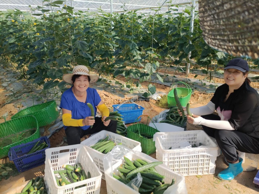 此時的大棚內(nèi)是熱鬧的、忙碌的、更是喜悅的,經(jīng)過一個月的精心呵護,蔬菜成熟,農(nóng)戶們正在忙著采摘。管理員嚴永德像是呵護自家孩子般把采摘的每根黃瓜、瓠子,仔細整理、裝箱、稱重、裝車,接著一輛輛裝滿“豐收果實”的車輛駛出視野,駛往各地的蔬菜大市場。