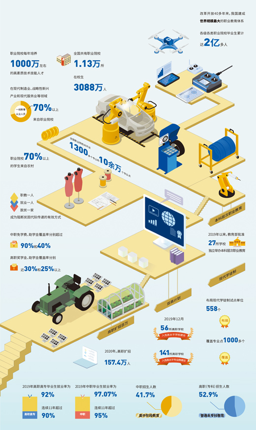 目前,我國已建成世界規模最大的職業教育體系。“職教20條”發布,明確職業教育與普通教育是兩種不同教育類型,具有同等重要地位。職業教育在培養技能人才、服務就業民生、助推產業升級、助力鄉村振興等方面日益發揮著重要作用。