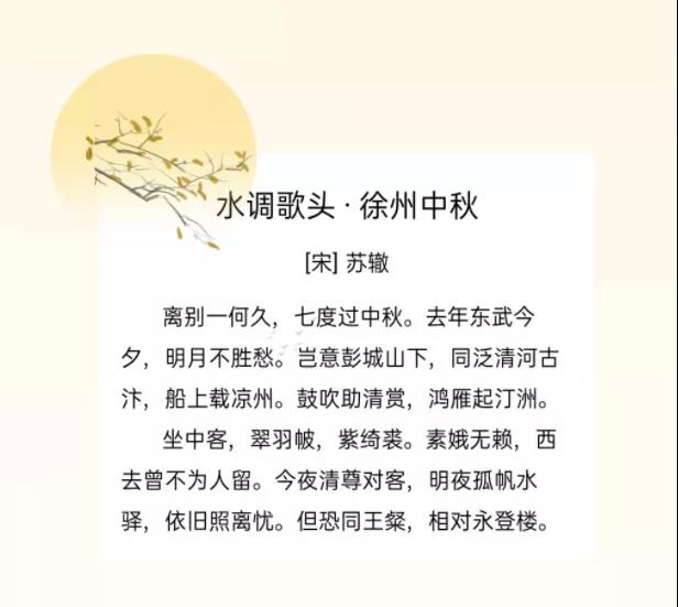 蘇軾寫出《水調歌頭·明月幾時有》的第二年,也就是公元1077年,他離京赴徐州任知州,蘇轍與之偕行。到達后,蘇轍在徐州停留了百余日,中秋節時,二人一起泛舟賞月,終于得過一個團圓的佳節。然中秋過后,蘇轍又要轉道赴南都(今河南淮陽)任職,于是蘇轍在臨別前寫下《水調歌頭·徐州中秋》。