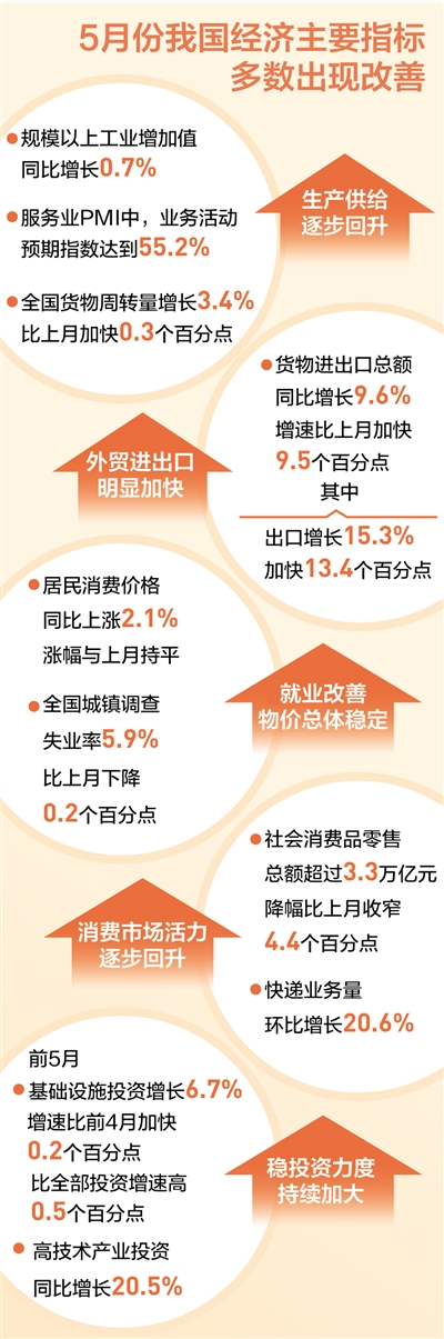 5月,我國經濟運行出現積極變化,主要指標多數出現改善。