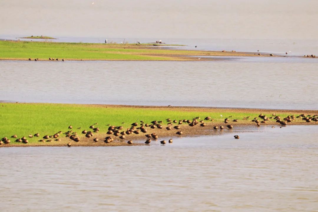 九月,午后的菜子湖國家濕地公園生態保育區灘涂上,數千只綠頭鴨、斑嘴鴨等悠閑曬著太陽,駐足打盹,構成一幅幅鳥與自然和諧相處的美麗畫卷,“鳥棲淺灘”的生態自然景觀正在形成。(攝影:陳春麗)