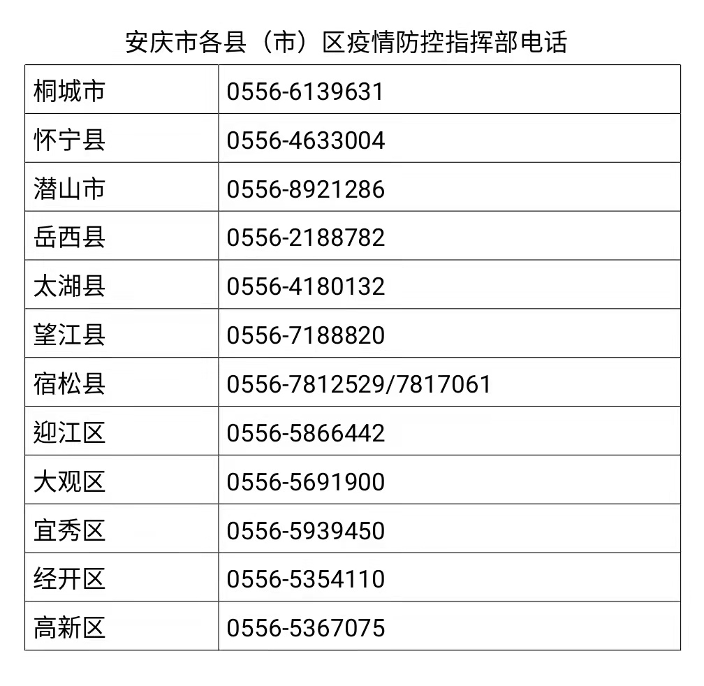 附:安慶市各縣(市)區疫情防控指揮部電話
