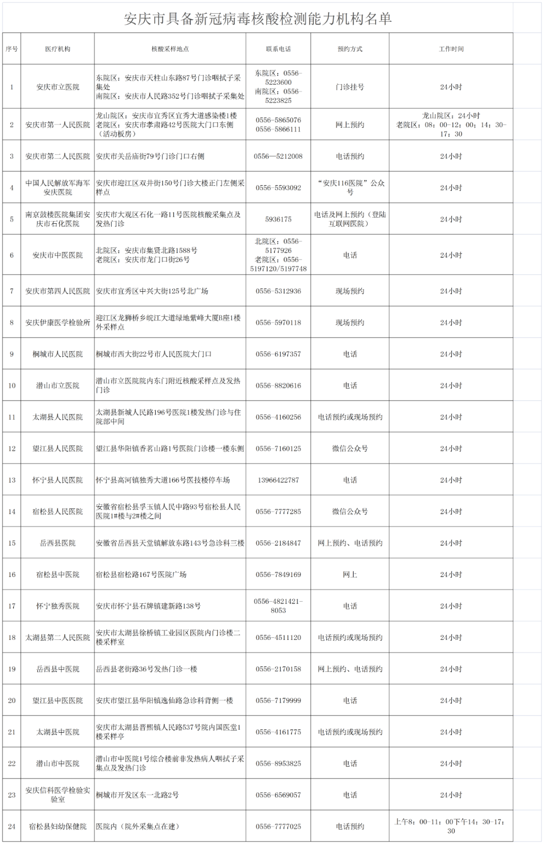 安慶市具備新冠病毒核酸檢測(cè)能力機(jī)構(gòu)名單