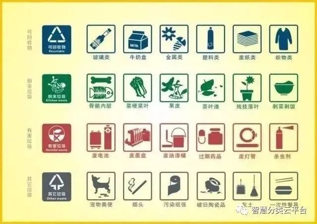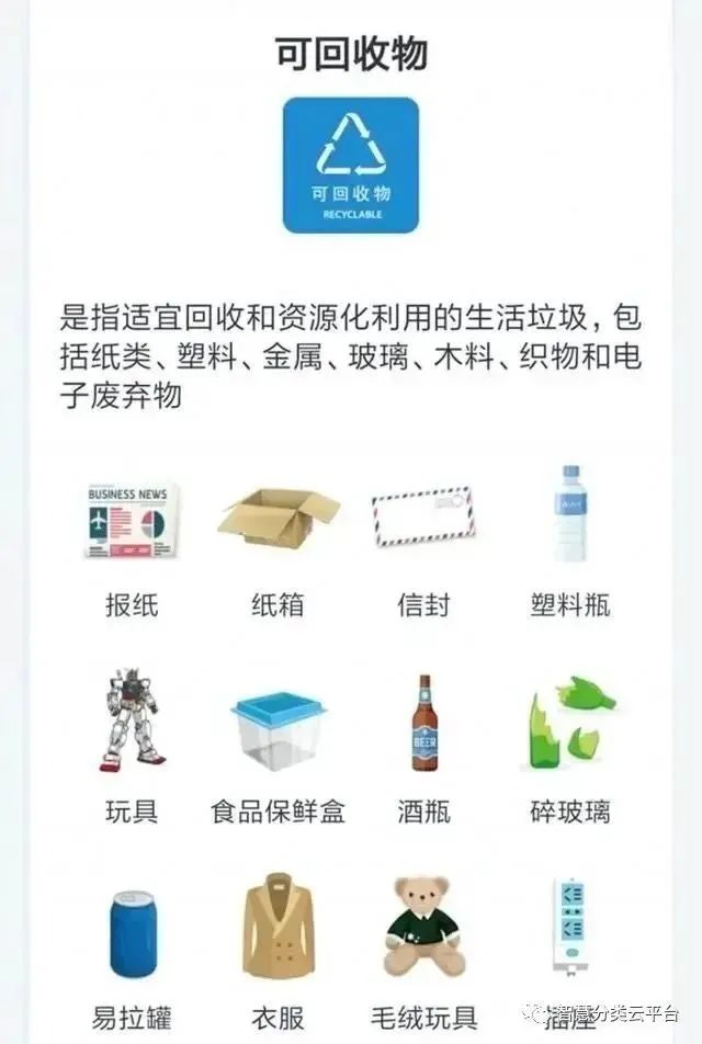、 可回收垃圾:再生利用價值較高,能進入廢品回收渠道的垃圾。
