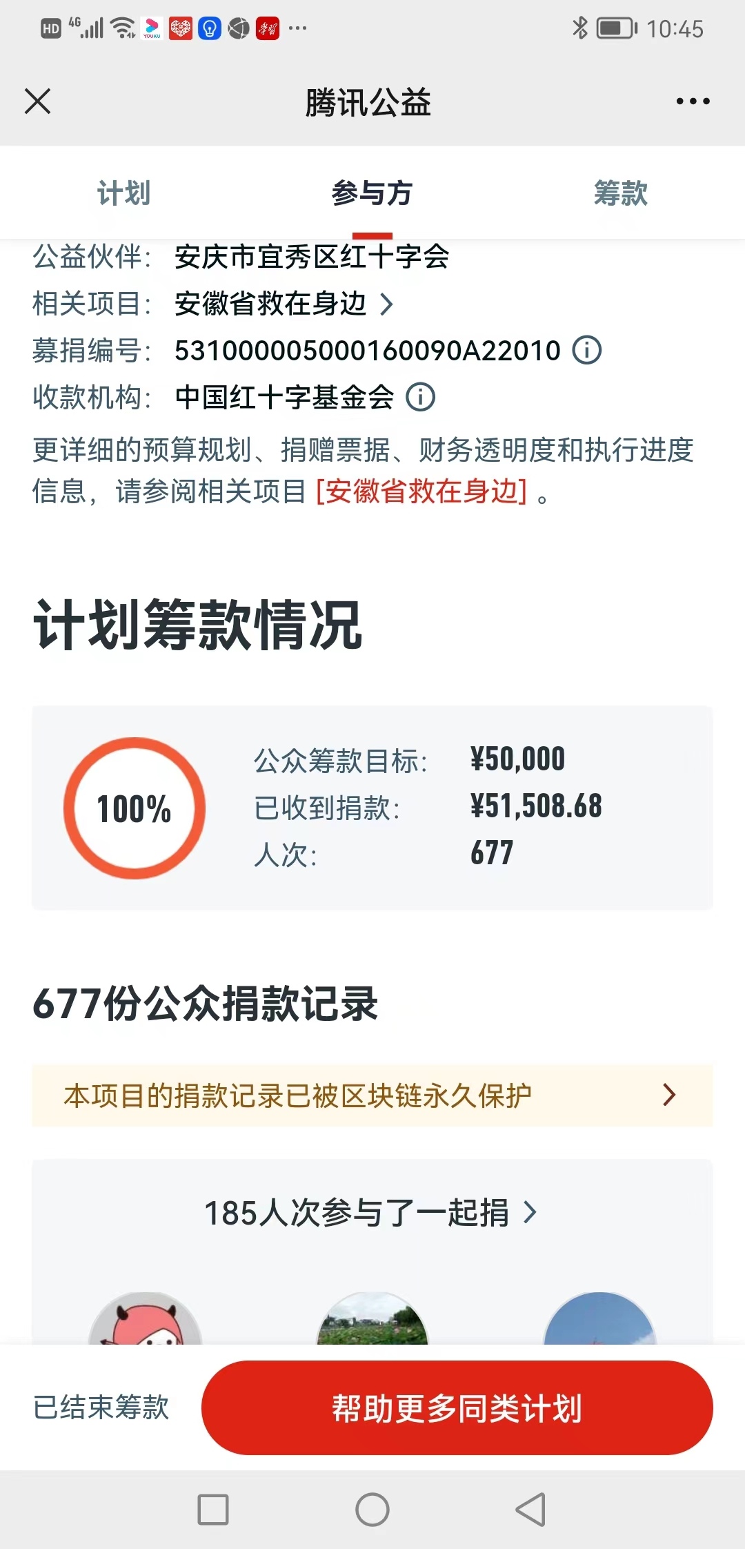 此次公益眾籌活動參與人數(shù)眾多,形成了“全員行動、人人參與”的公益氛圍。據(jù)統(tǒng)計,共有677人(次)參與捐款,185人次參與了“一起捐”。下一步,宜秀區(qū)紅十字會將繼續(xù)以公益活動為抓手,動員社會各界積極參與公益事業(yè),弘揚“人道、博愛、奉獻(xiàn)”的紅十字精神,倡導(dǎo)“人人皆可參與”的公益理念,助力社會主義核心價值觀建設(shè)。(宜秀區(qū)紅十字會)