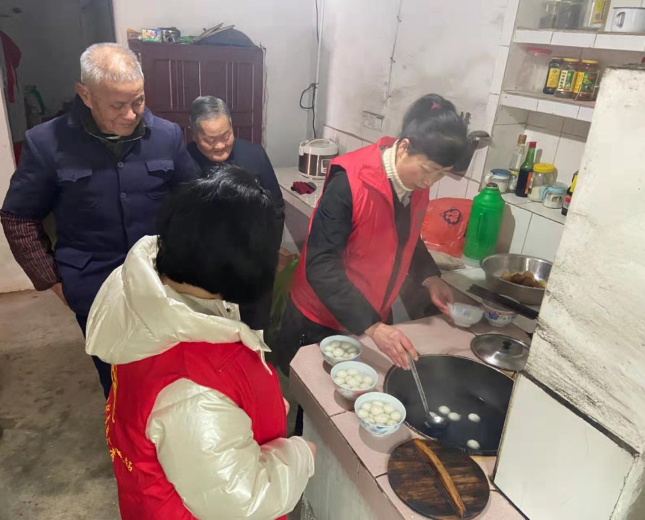 活動現場,志愿者們分頭行動。生火,燒水,煮元宵,準備碗筷......老人們和志愿者一起圍在灶臺旁嘮著家常,現場笑語不斷,到處洋溢著“家”的味道、“家”的溫馨。室外雖寒氣襲人,但室內卻溫暖四溢、其樂融融。