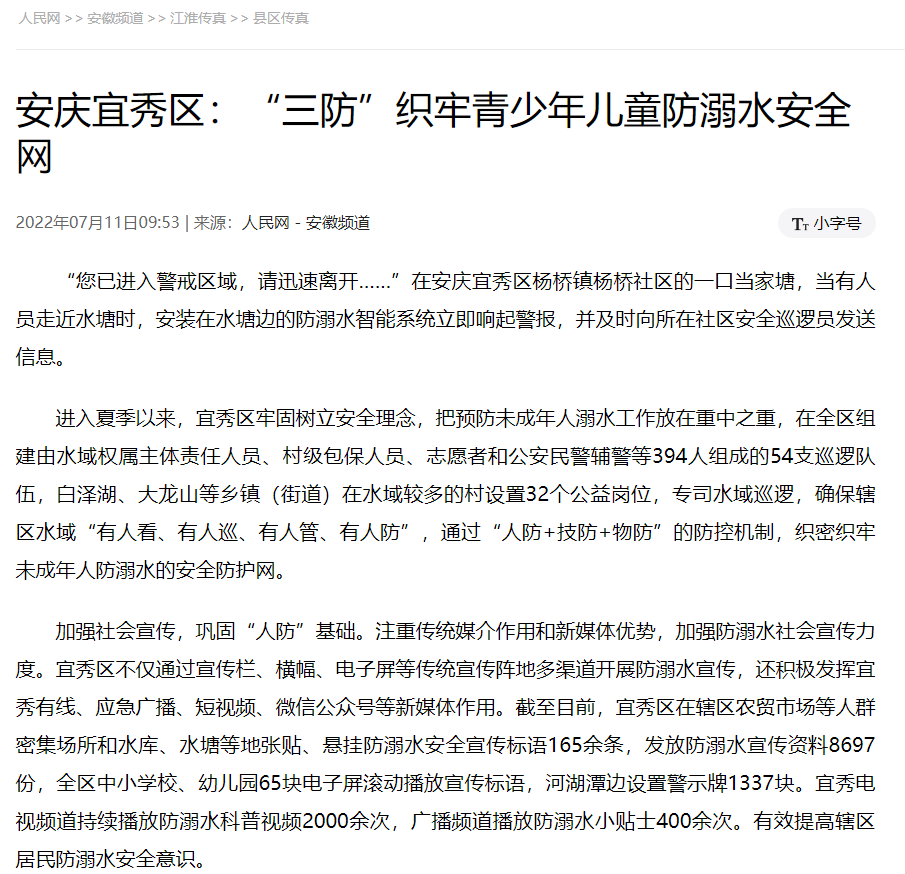 【人民網】安慶宜秀區:“三防”織牢青少年兒童防溺水安全網