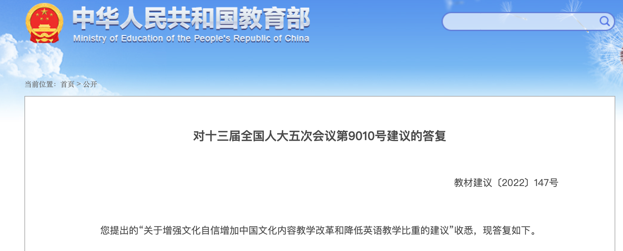 對(duì)此,教育部在答復(fù)中表示,外語(yǔ)是學(xué)生德智體美勞全面發(fā)展的重要組成部分,有助于培養(yǎng)和發(fā)展學(xué)生語(yǔ)言能力、文化意識(shí)、思維品質(zhì)、學(xué)習(xí)能力等核心素養(yǎng),培養(yǎng)學(xué)生中國(guó)情懷、國(guó)際視野和跨文化溝通能力。