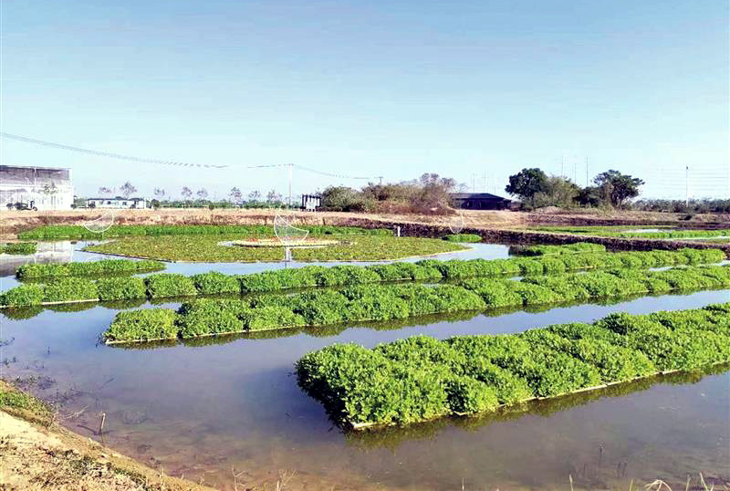 徐善新在附近開辟出50畝基地,打造水上風能旋轉浮島、發展無土栽培,既能凈化水質,又能形成景觀,還能產生收益。養魚工廠的糞便殘渣會通過吸污管道直接排到他的水生蔬菜基地。“我們在水上種農作物,在水下養水產。”徐善新介紹,魚糞會給水生蔬菜提供充足的養分,同時水生蔬菜也能吸收水中的氨氮,此外,水下養殖的田螺、甲魚等水產在凈化水質的同時,還能再增加一份收益。通過“魚菜共生”“糧魚共生”,最終把農村面源污染“吃干榨盡”變成財富。而凈化后的水,又能流回魚塘去養魚。