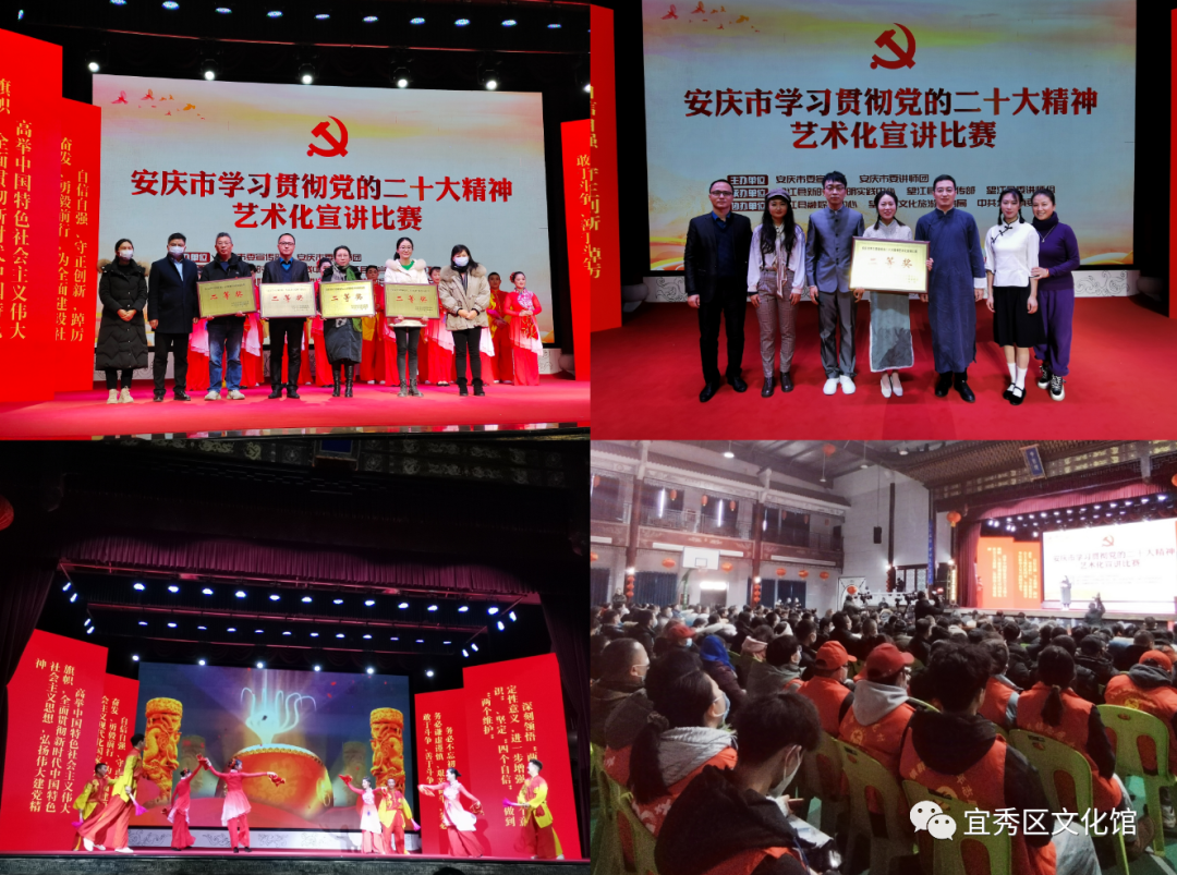 2023年1月17日下午,由市委宣傳部、市委講師團(tuán)主辦的“安慶市學(xué)習(xí)貫徹黨的二十大精神藝術(shù)化宣講比賽”在望江縣太慈鎮(zhèn)桃?guī)X村全民健身中心隆重舉行。全市共有10個(gè)優(yōu)秀作品參加宣講,由宜秀區(qū)委宣傳部選送、區(qū)文化館編創(chuàng)的配樂(lè)視頻朗誦《信仰的力量》精彩演繹,喜獲二等獎(jiǎng)。