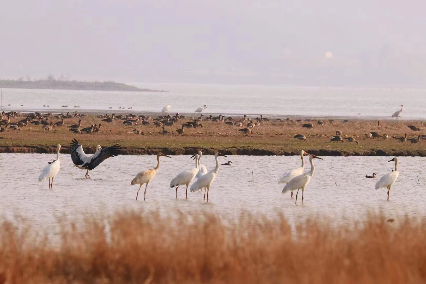 全球的白鶴數量僅存4000多只,被世界自然保護聯盟評估為極危物種。白鶴在我國被列為國家一級保護野生動物。白鶴對越冬地生態環境要求十分苛刻,是濕地環境的標志物種。(攝影:陳春麗 審核:王雪峰)