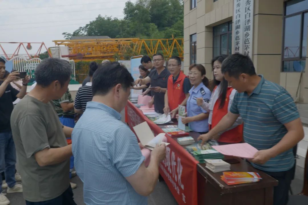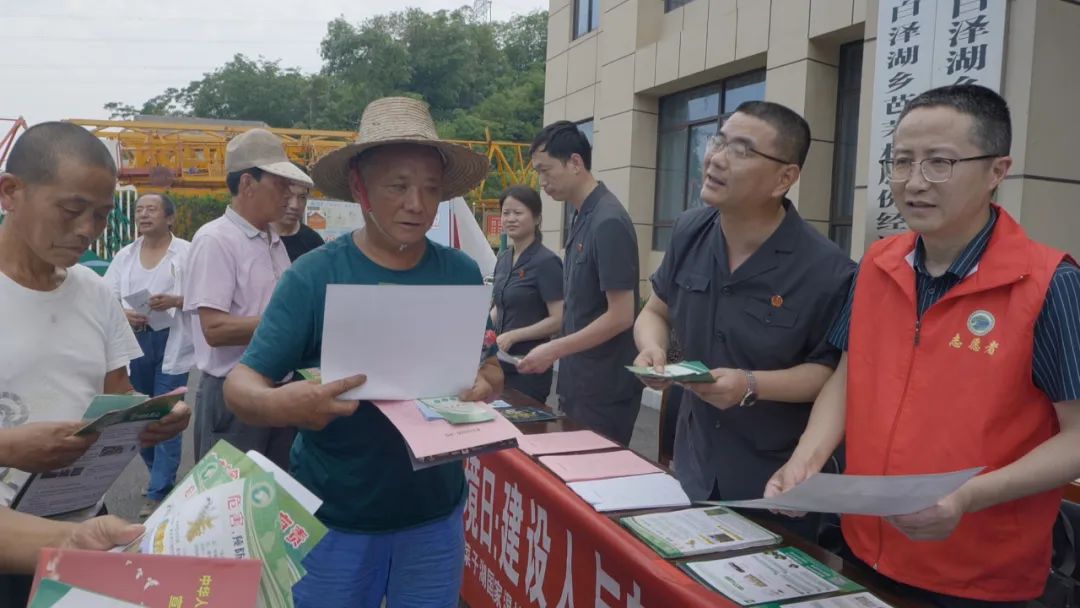 6月2日,楊橋法庭、菜子湖國家濕地公園保護中心及白澤湖鄉政法委的工作人員首先來到芭茅村村部廣場,設立宣傳擺臺,向來往村民發放環境保護相關的宣傳資料,并為村民們答疑解惑。