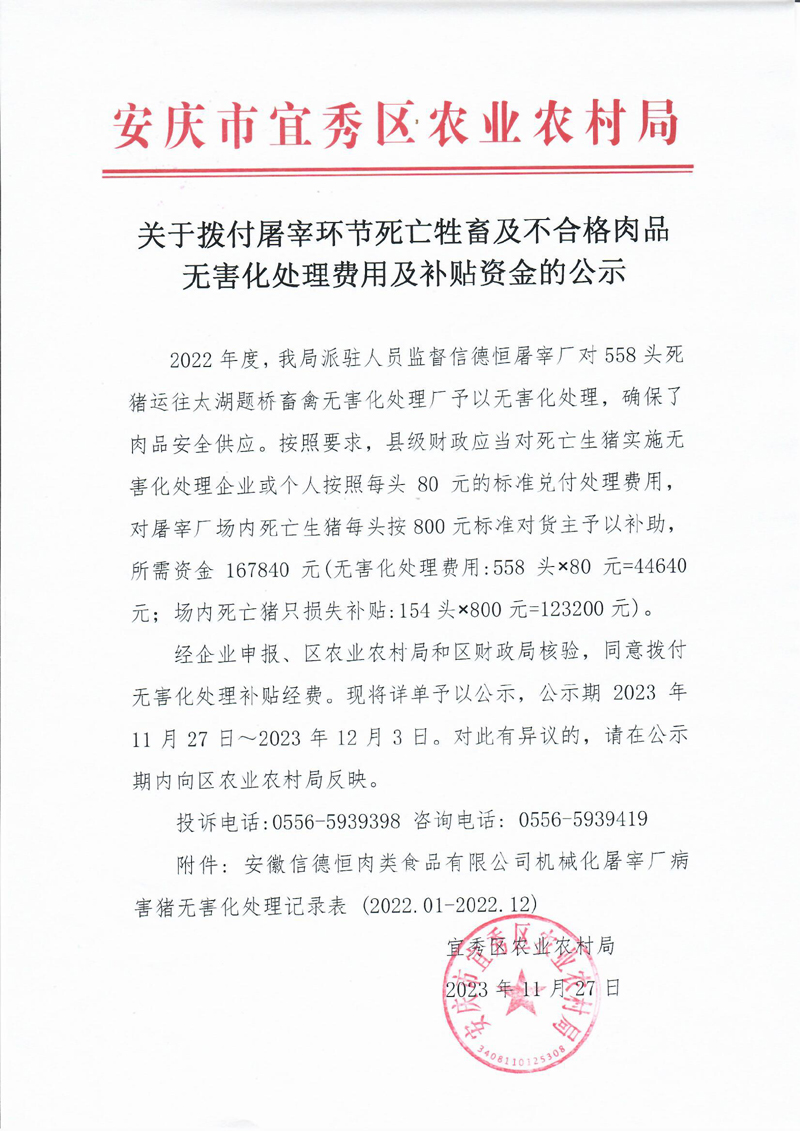 關于2023年度屠宰環節死亡牲畜及不合格 肉品無害化處理費用及補貼資金的公示