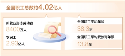 本報北京3月26日電  (記者易舒冉)記者日前從中華全國總工會獲悉:第九次全國職工隊伍狀況調查已于近期結束,調查表明,目前全國職工總數4.02億人左右,新就業形態勞動者8400萬人,農民工2.93億人;職工平均年齡38.3歲、平均受教育年限13.8年。調查還顯示,職工理想信念更加堅定,主人翁地位持續鞏固,越來越多的職工積極投身“當好主人翁、建功新時代”“建功‘十四五’、奮進新征程”等主題勞動和技能競賽。