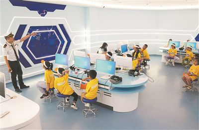 7月8日,在極地海洋研學教育基地“淘學企鵝館”的VR教室,工作人員在給孩子們進行科普授課。新華社記者 王建威攝