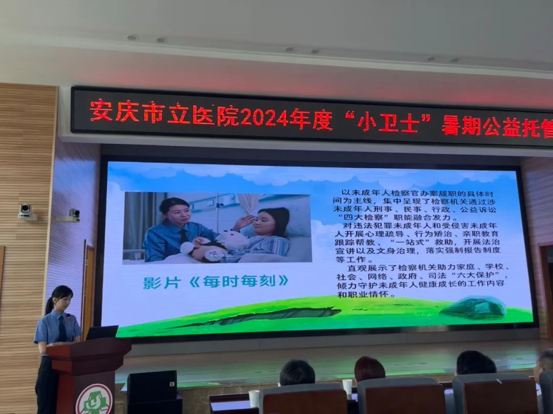 關愛未成年人健康成長是檢察機關義不容辭的責任。7月8日,宜秀區人民檢察院“宜啟來”未檢團隊應邀參加市立醫院2024年度“小衛士”暑期公益托管班開學典禮,并為托管班的孩子們帶來一堂生動的法治課。