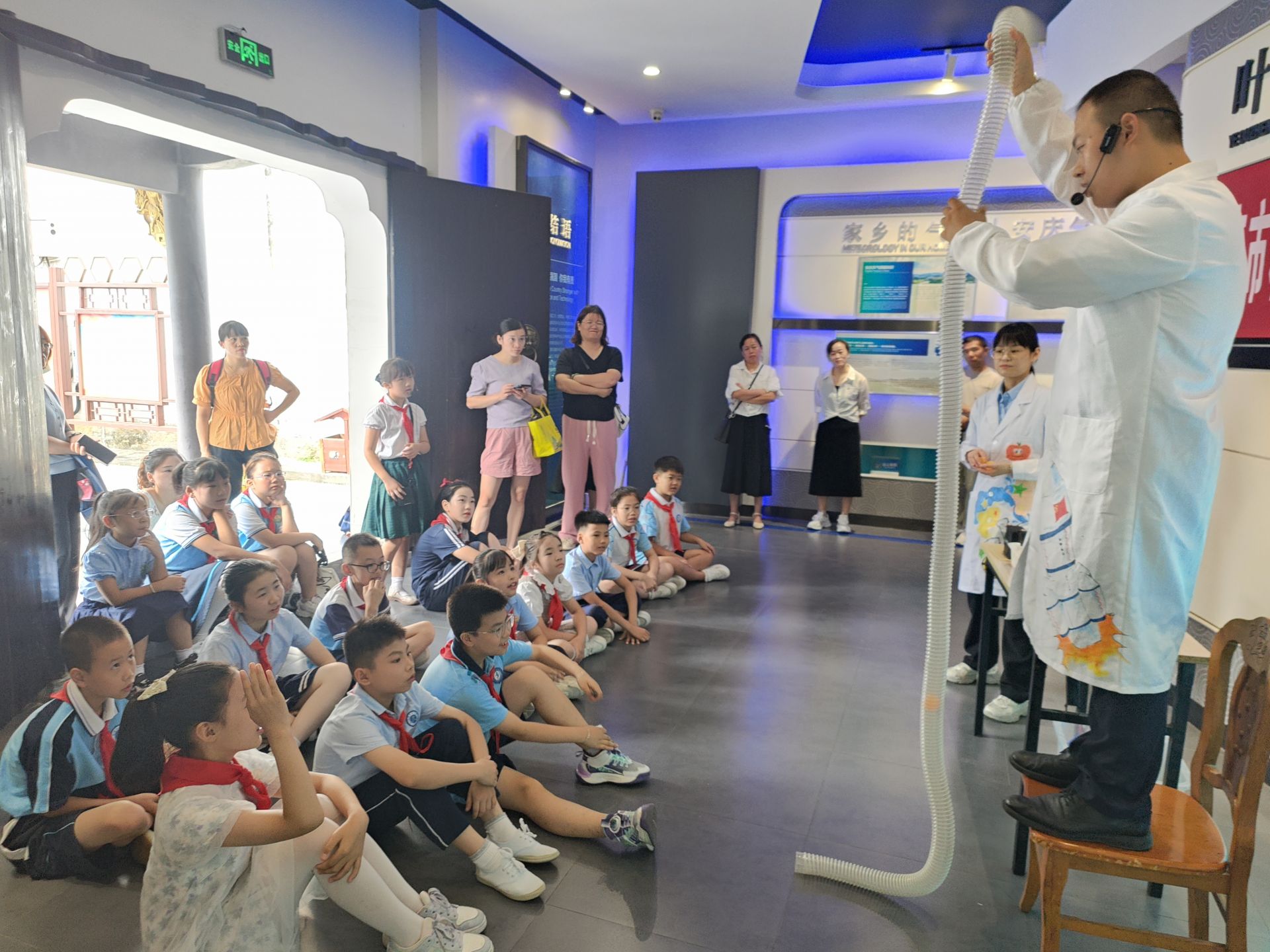 經過前期初賽的評選和角逐,宜秀區轄區內各學校共產生了28位選手進入決賽,決賽分為兩組,有18位選手參加葉篤正生平陳列館的講解,其余10位選手參加葉篤正氣象科普館的講解。進入決賽的小選手們都口齒清晰、語言流暢、儀態大方,儼然都是一副專業講解員的模樣,他們以聲情并茂、生動有趣的講解方式,向人們呈現了中國氣象大師葉篤正的生平事跡以及他為國家氣象事業作出的杰出貢獻。