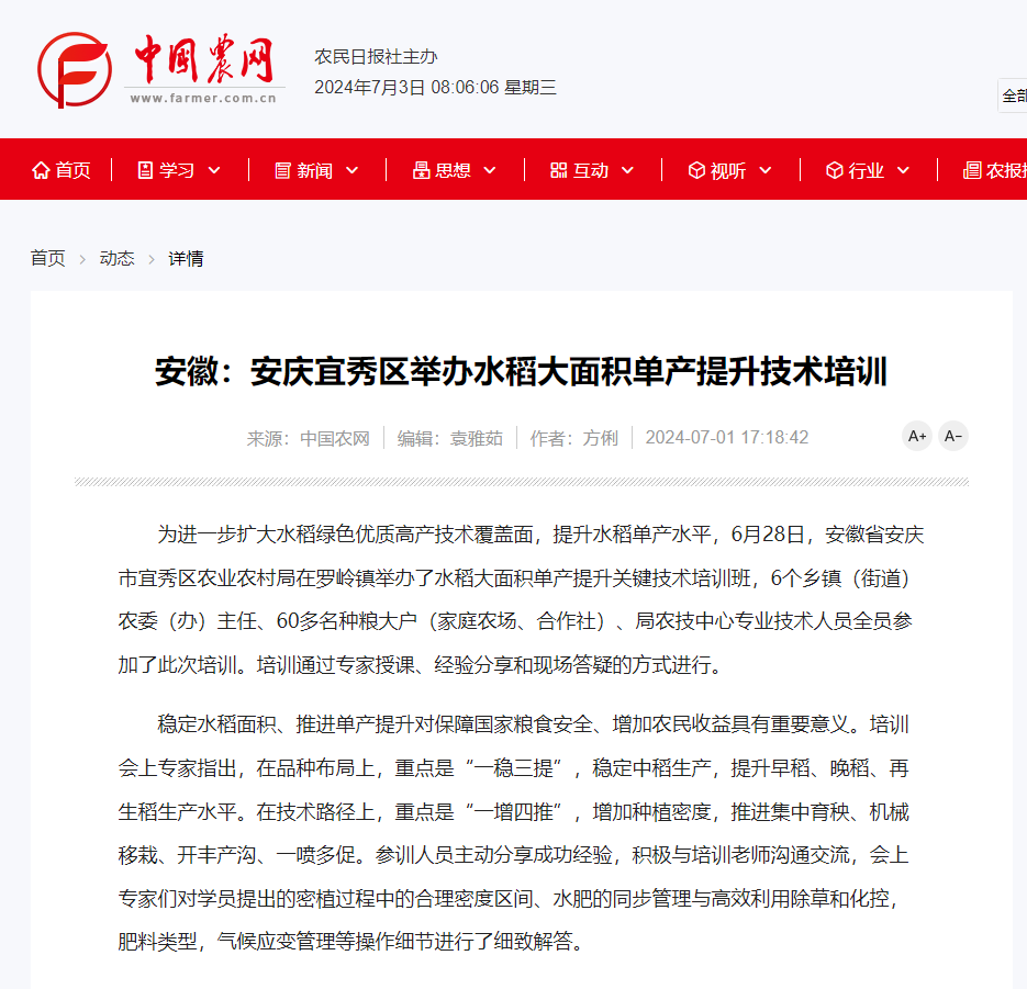 【中國農網】安徽:安慶宜秀區舉辦水稻大面積單產提升技術培訓