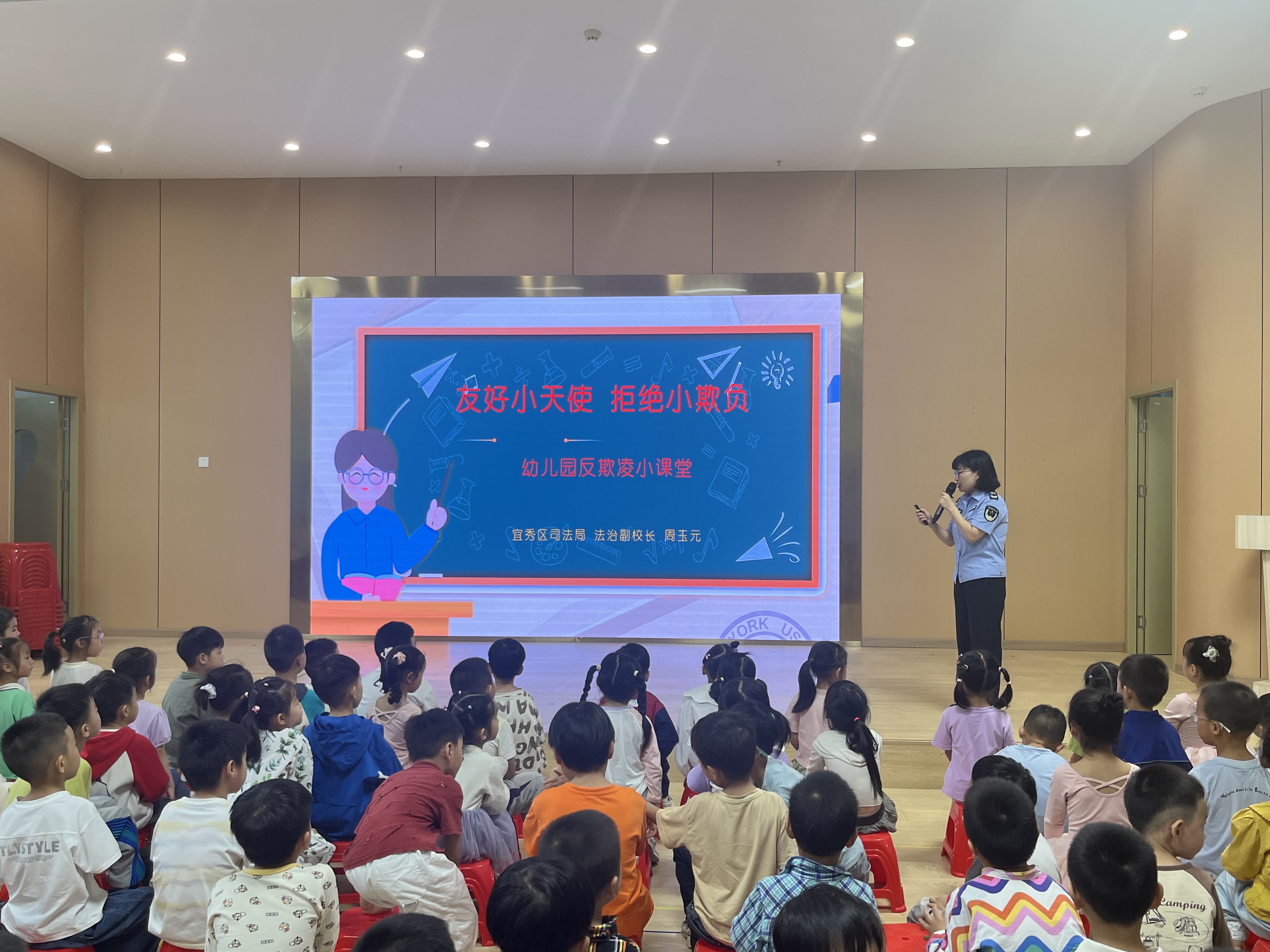 活動中,法治副校長針對幼兒認知特點,精心選取動畫為載體,用淺顯易懂的語言為孩子們講解了有關校園欺凌方面的知識和"遇到欺凌怎么辦"、"如何爭做友好小衛士"等實用內容,幼兒園小朋友們聽得專注、回答踴躍,增強了孩子們法治意識和自我保護意識。本次活動在孩子們心中播下法治的種子,為青少年兒童健康成長奠定法治基礎,為推進平安法治校園建設提供了有力支持。